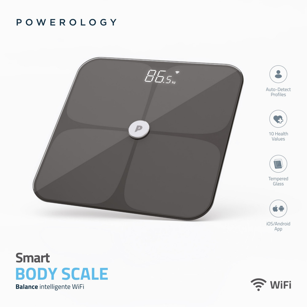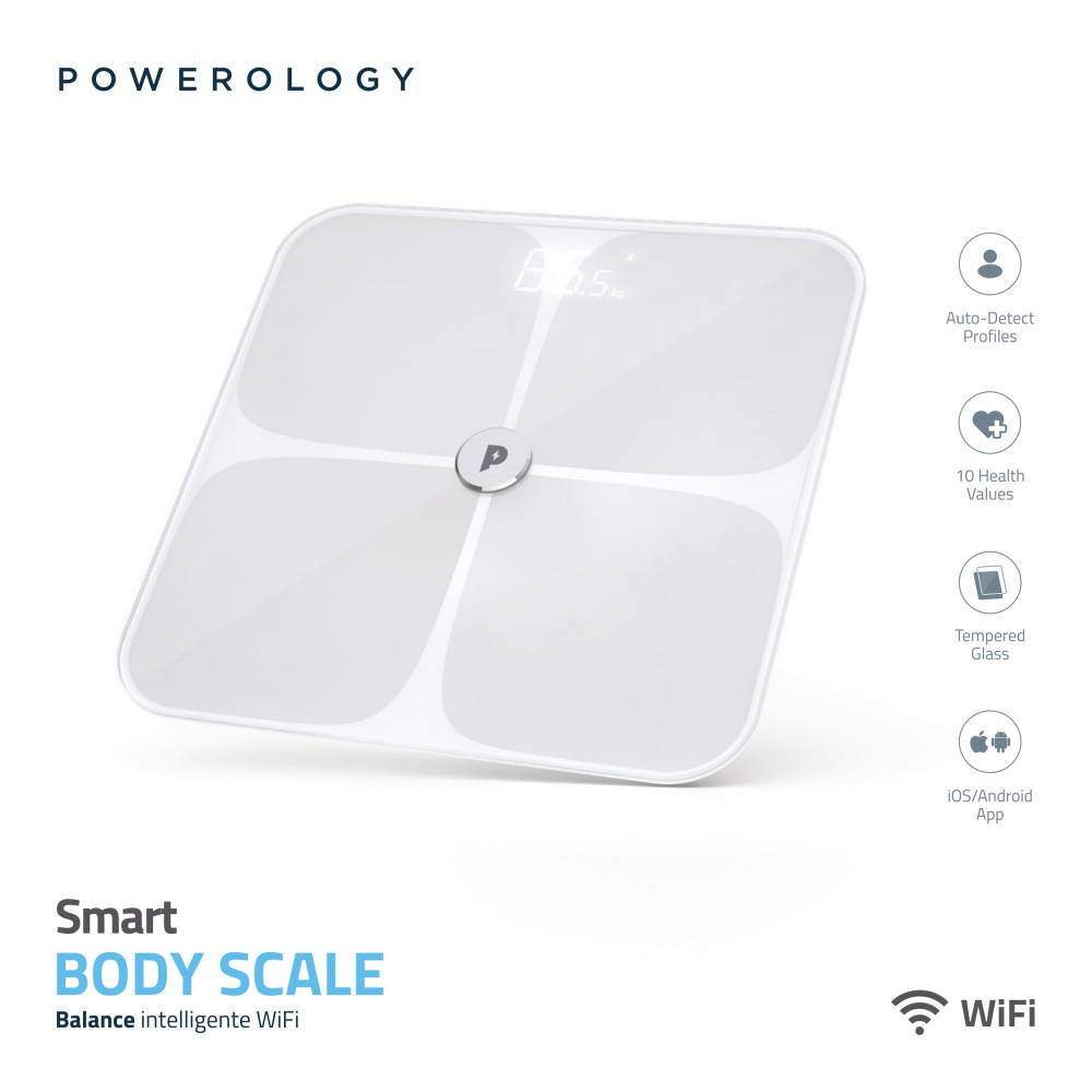 مقياس الجسم الذكي Powerology WiFi عبارة عن أداة ذكية للحفاظ على لياقتك. ابق على علم بأي تغييرات في جسمك ودع هذا الميزان يتتبع صحتك من أجلك. ما يصل إلى 10 قيم في القياس تُعلمك بأي شيء تقريبًا. سيعرف ملف تعريف الكشف التلقائي من أنت بمجرد أن تقف على هذا المقياس. امنح حياة صحية لعائلتك وأحبائك من خلال إنشاء ملف تعريف لكل منهم. الزجاج المقسى هو حقيقة متانته.